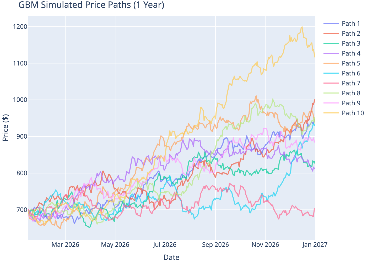 We simulate 10 possible price paths for a stock over 1 year using historical SPY parameters.